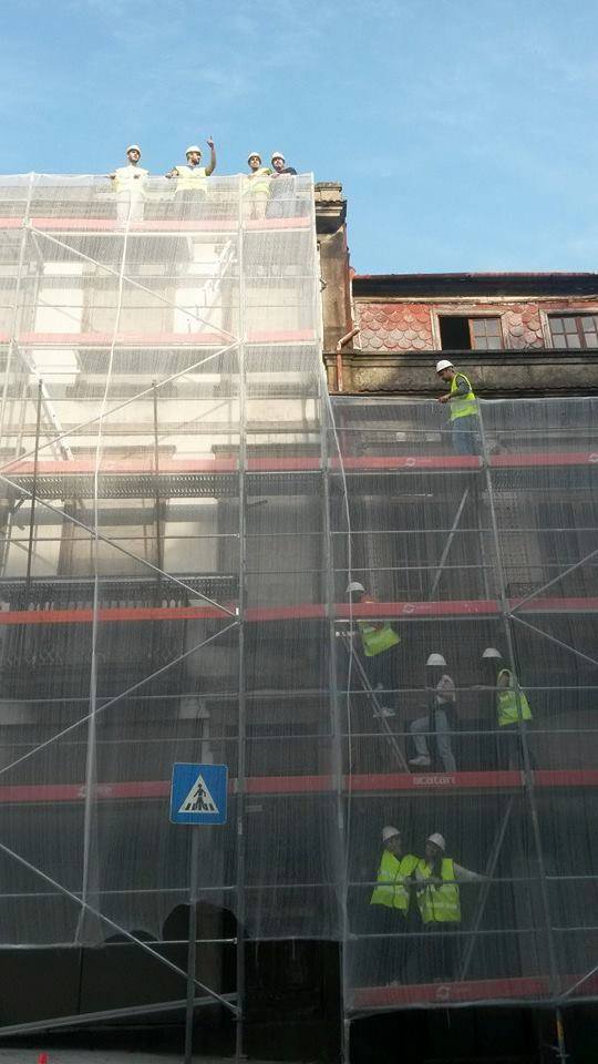 Ação conjunta implicou uma cumplicidade testada nos primeiros dias, quando da definição de estratégias e procedimentos; houve que acertar amplitude de gestos e extensão de pinceladas, de modo a que o desenvolvimento de uma pessoa, coincidisse com o traçado da outra. Mediante uma fragmentação do desenho em partes constitutivas, cada pessoa ficou encarregue de cumprir um trecho de desenho, convergindo para o desenho/pintura como todo. A espessura do desenho acumulou-se à densidade desigual da superfície das fachadas. As varandas, umbrais de portas e janelas, as reentrâncias do sótão ou as caleiras serviram de cenários, desacreditados estes elementos como obstáculos. Assim se instituiu uma outra visão da rotina percorrida ou hierática de quem demora a olhar. Pois que as ruínas apossaram-se da pintura, propondo novas derivas que se alongam, sobem nos traços compactos ou na fluidez de linhas volumetrizadas. Afinal, as fachadas em pedra são matéria densa que, apesar do estado de degradação, guardam os motivos refletidos do pensamento do artista brasileiro e das efabulações impulsionadas nos portugueses.