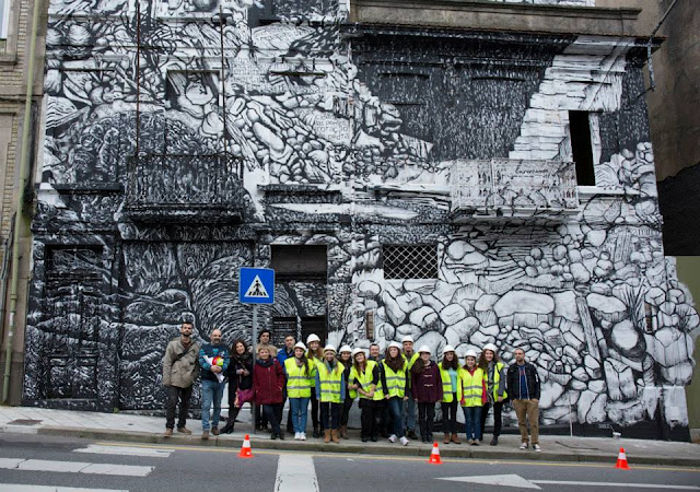 As fachadas absorveram camadas de tintas sobrepostas ou ladeadas, apresentando uma espessura texturada que perfila o alçado, os contornos em ângulos curvados pela perceção de quem vai circulando na rua, sobe ou desce a calçada. É um desenho pintado e enorme que acompanha os moradores do bairro, surpreendendo-os.